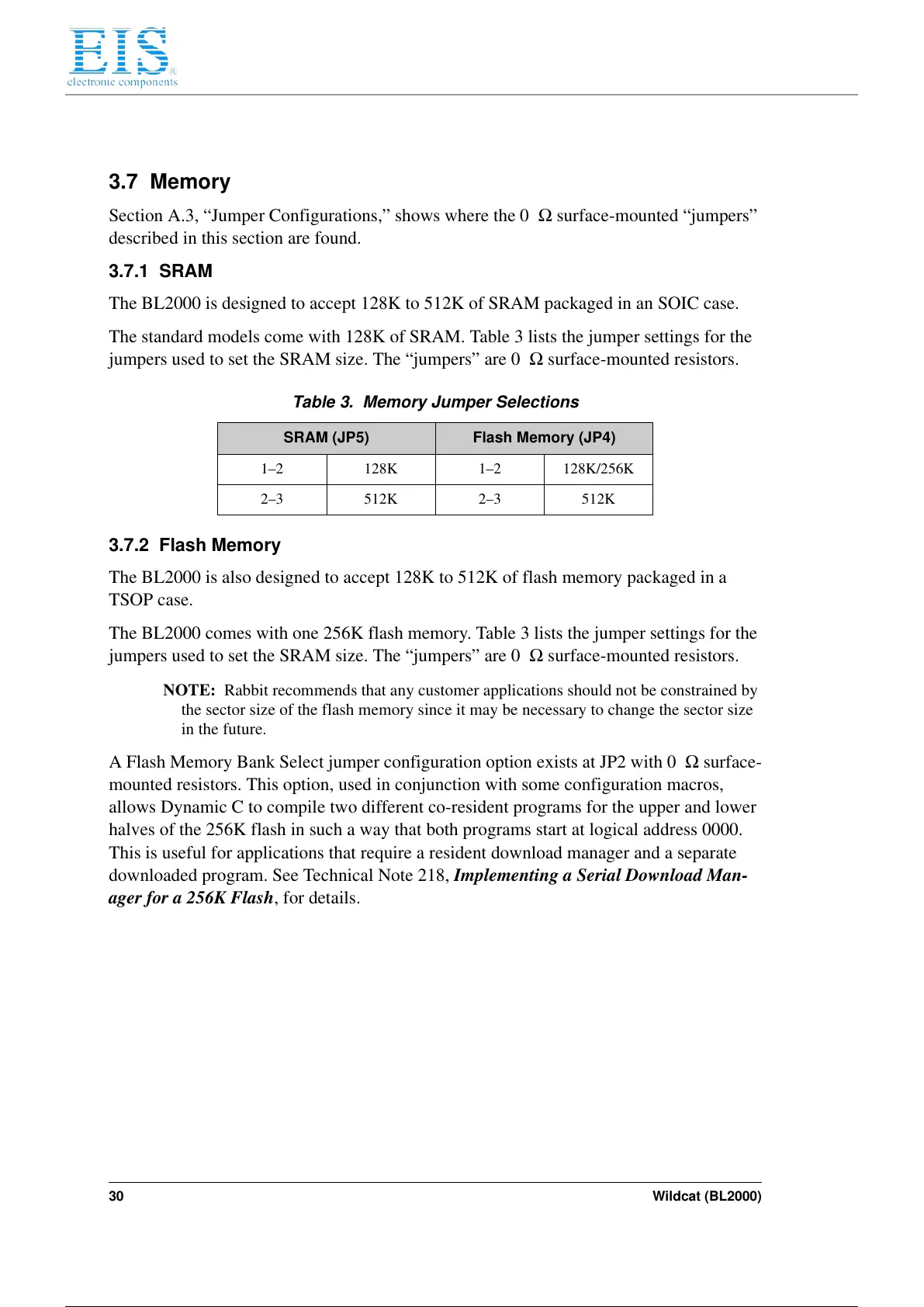 The BL2000 comes with one 256K flash memory. Table 3 lists the jumper settings for the