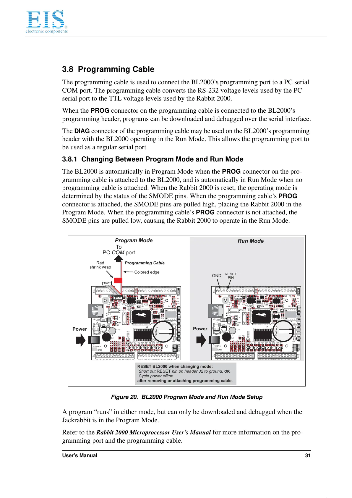 programming cable is attached. When the Rabbit 2000 is reset, the operating mode is