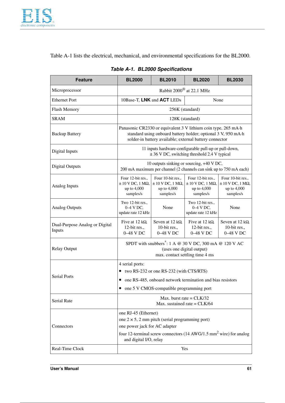 Table A-1. BL2000 Specifications