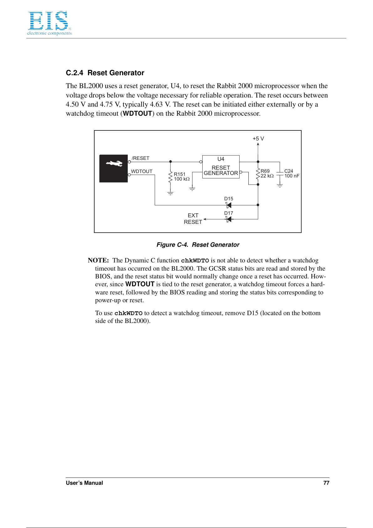 The BL2000 uses a reset generator, U4, to reset the Rabbit 2000 microprocessor when the