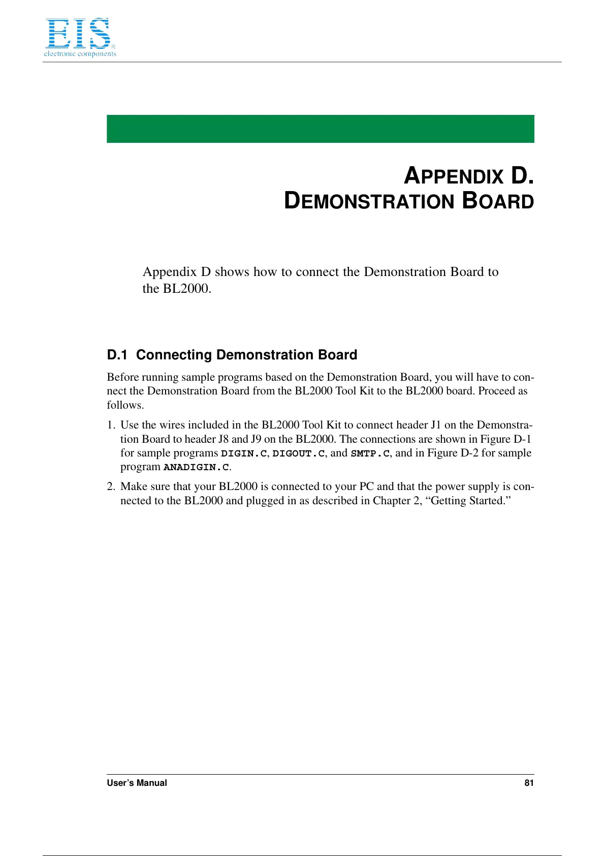 Board to header J8 and J9 on the BL2000. The connections are shown in Figure D-1