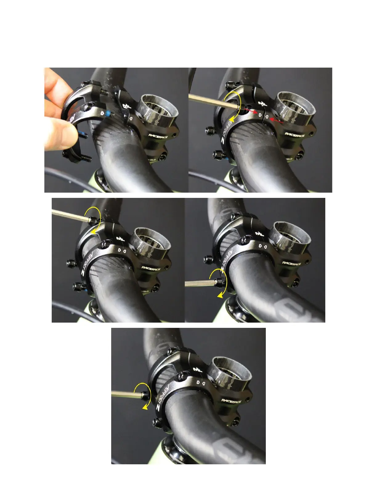 the handlebar in place. Make sure to tighten the top two bolts first, and the bottom two bolts second.