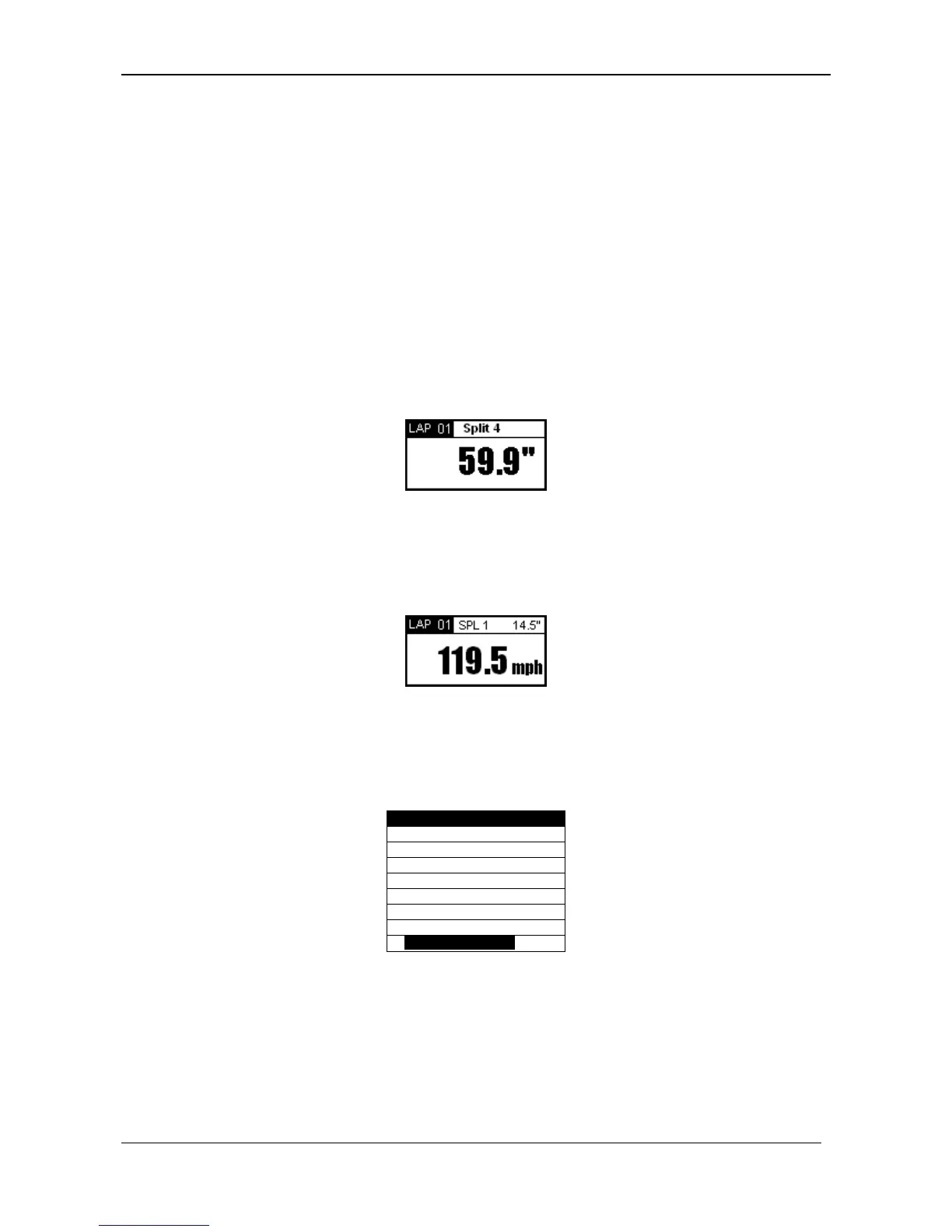 Lap/Split time, as shown above, or the Vehicle speed as it crosses a split point or start/finish line;