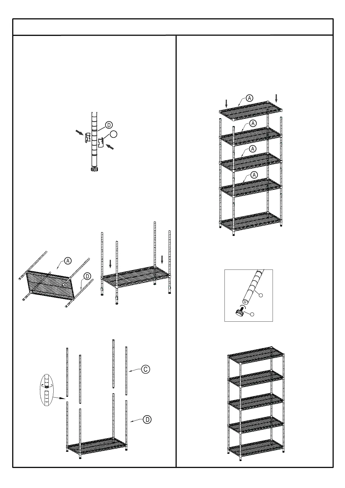 Place Shelf (A) on its side and slide the Bottom Pole (D) through the holes