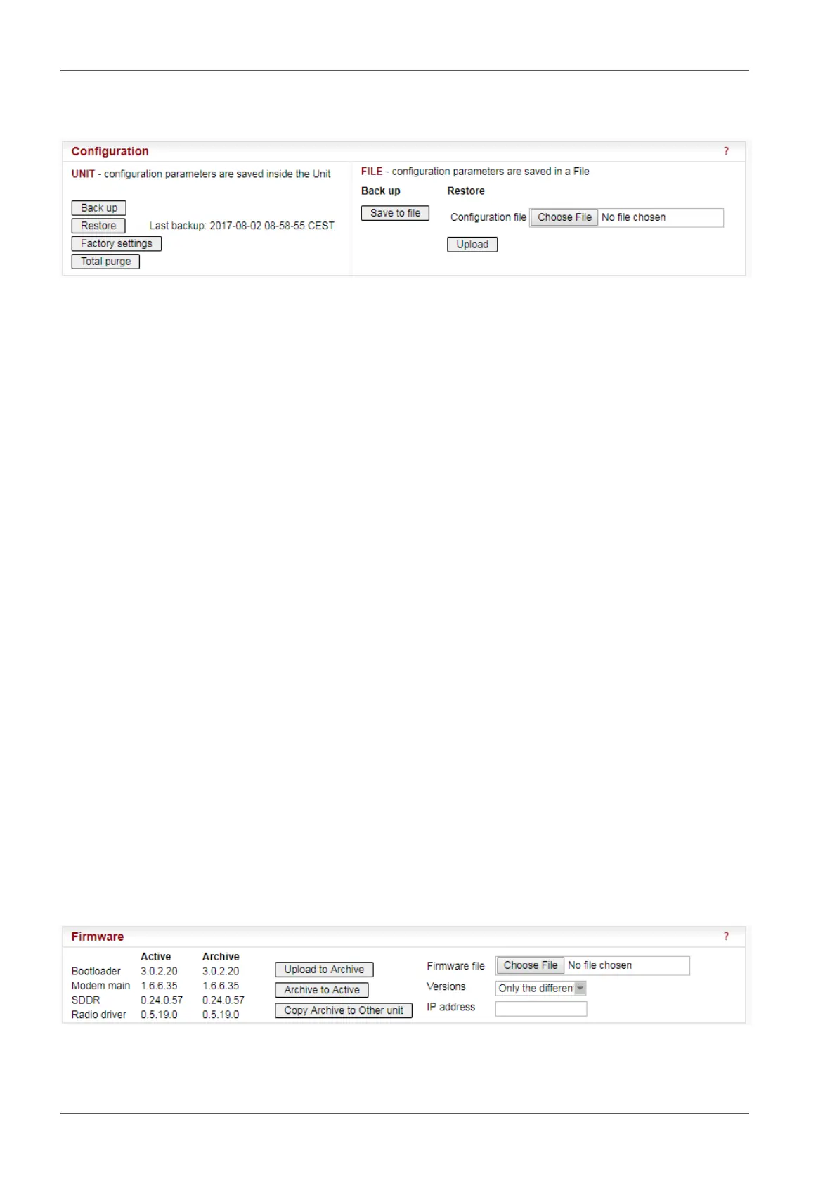 • Restore – configuration saved in the backup file in the unit is activated and the unit reboots itself.