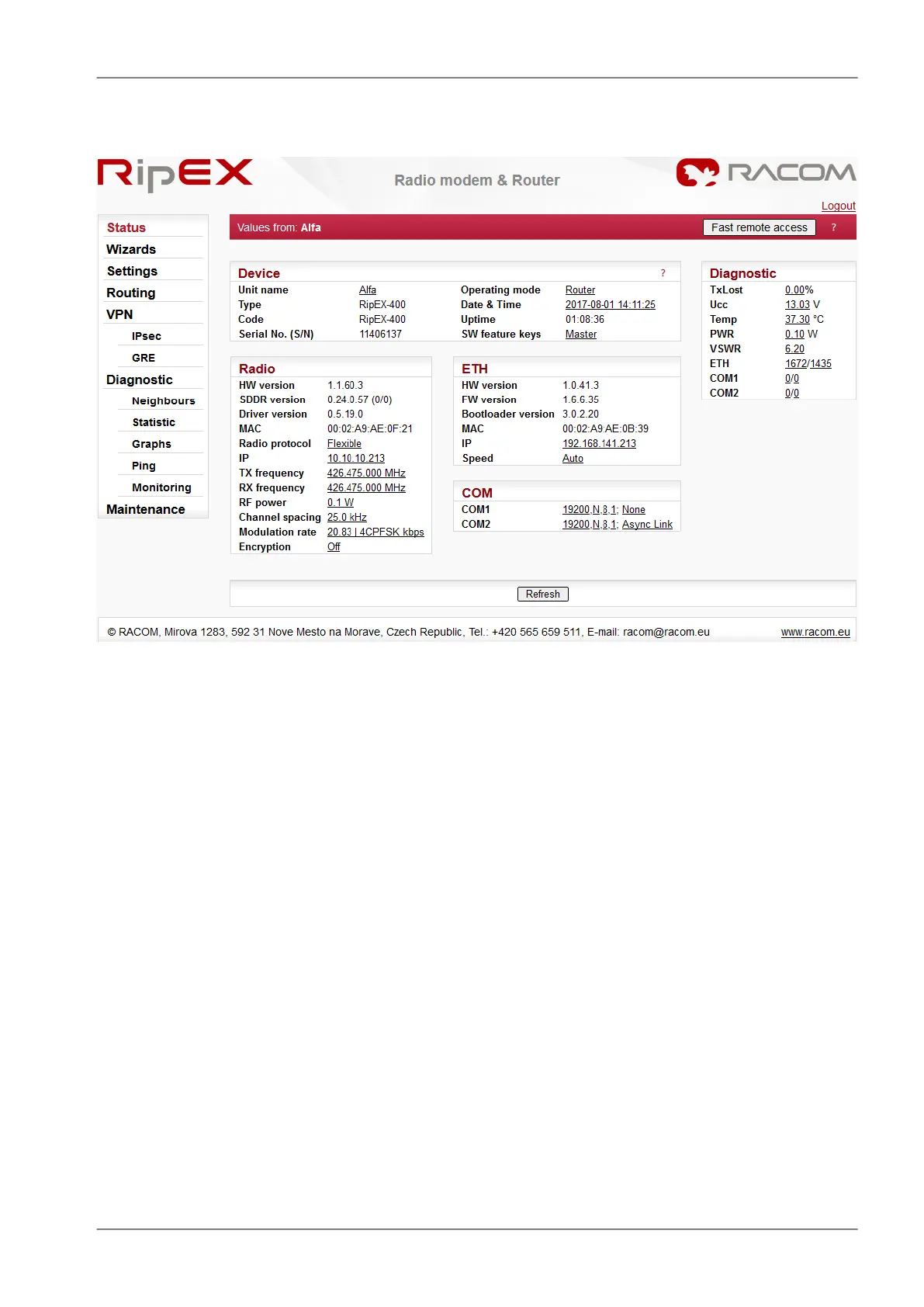 This part of Status page displays basic information about the RipEX (e.g. Serial No., MAC addresses,