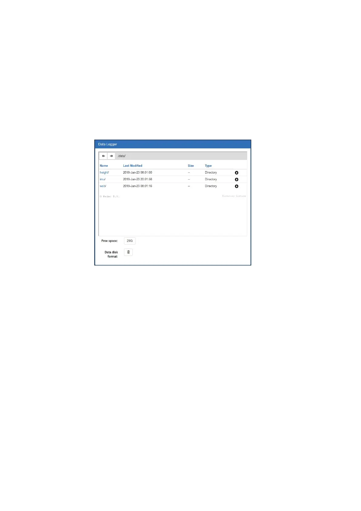 The folder structure used for data logging is one directory per sub-system. In this directory,