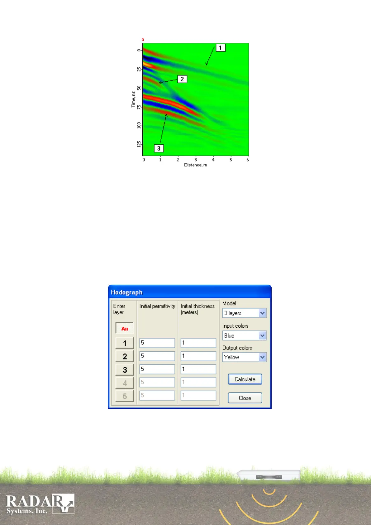 To calculate medium characteristics (wave velocity or permittivity) by hodographs of