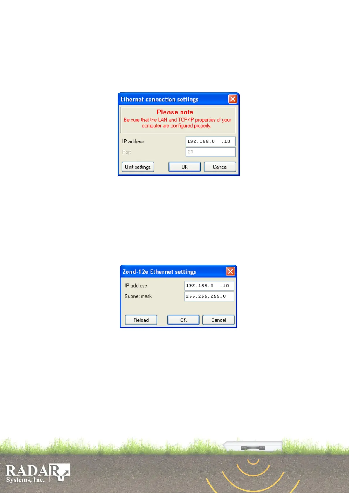 2. Enter Radar / Connection settings Menu option. The Ethernet connection