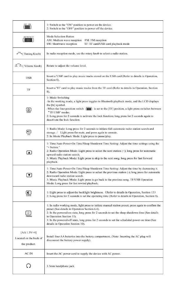 Raddy RF206 - Button and Function Guide; Power Switch Operation; Mode and Band Selection; Tuning and Volume Controls