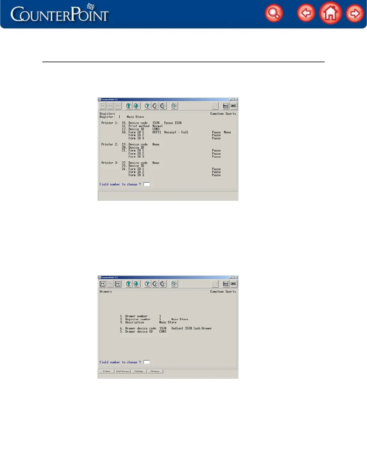 14. On the next Registers screen, enter 1520 in the Device code field for the Printer 1 device,