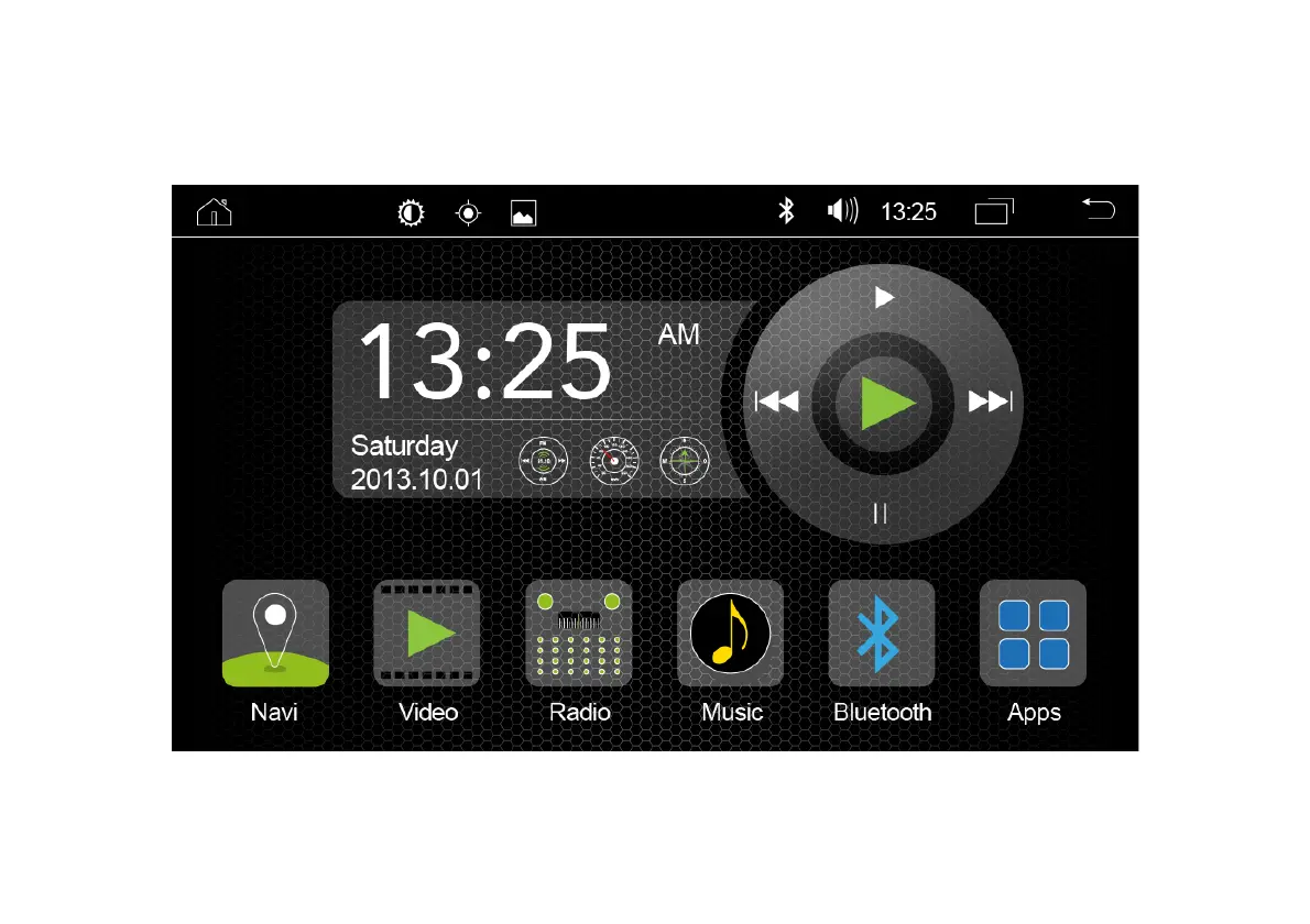The main menu interface contains Navigation, Radio, Apps, Bluetooth and Music icons. Tap on these icons to open the