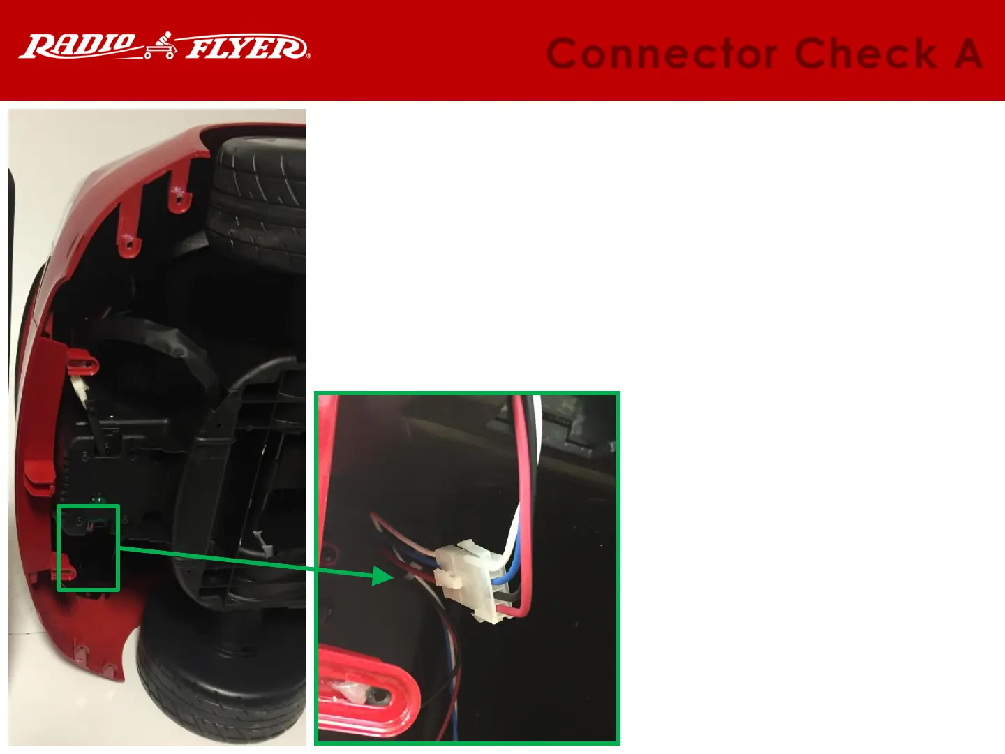 Radio Flyer 910 - Connector Checks for Car Issues; Connector Check A: Battery Not Charging