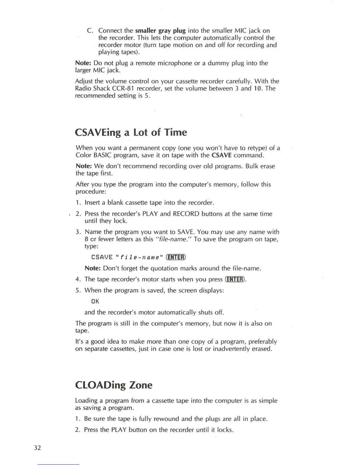 Radio Shack TRS-80 Color Computer 2 - CSAVEing a Lot of Time; CLOADing Zone