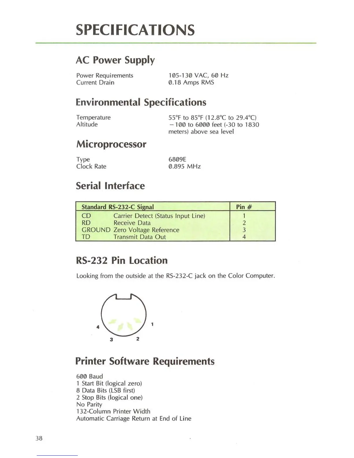 Radio Shack TRS-80 Color Computer 2 - SPECIFICATIONS; AC Power Supply; Microprocessor; Serial Interface