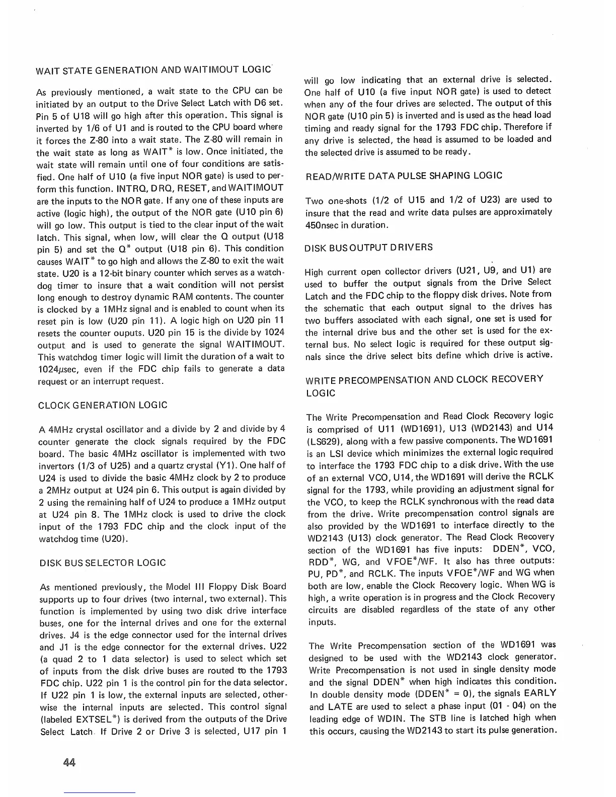 Radio Shack TRS-80 Model III - Wait State Generation and Waitimout Logic; Clock Generation Logic; Disk Bus Selector Logic; Write Recompensation and Clock Recovery Logic