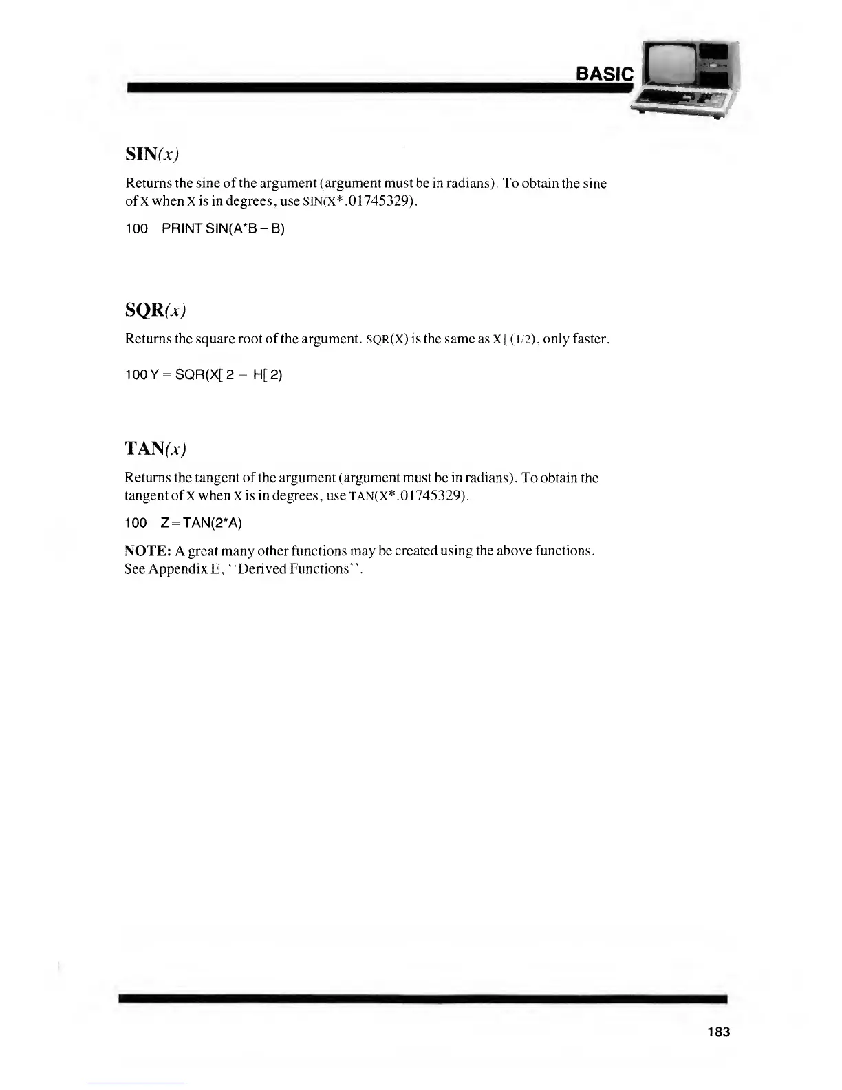 Returns the square root of the argument. SQR(X) is the same as X[(l/2), only faster.
