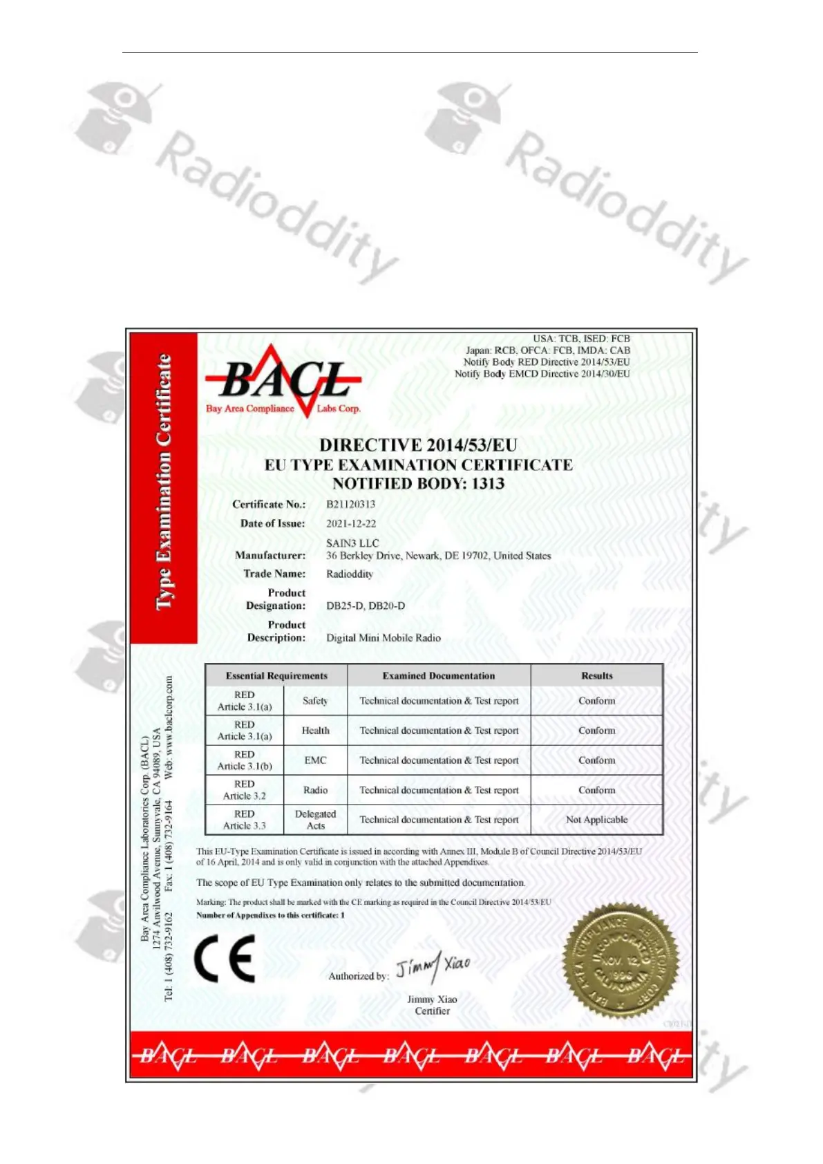 Below you find a copy of the CE certificate for our Radioddity DB25-D mobile radio.