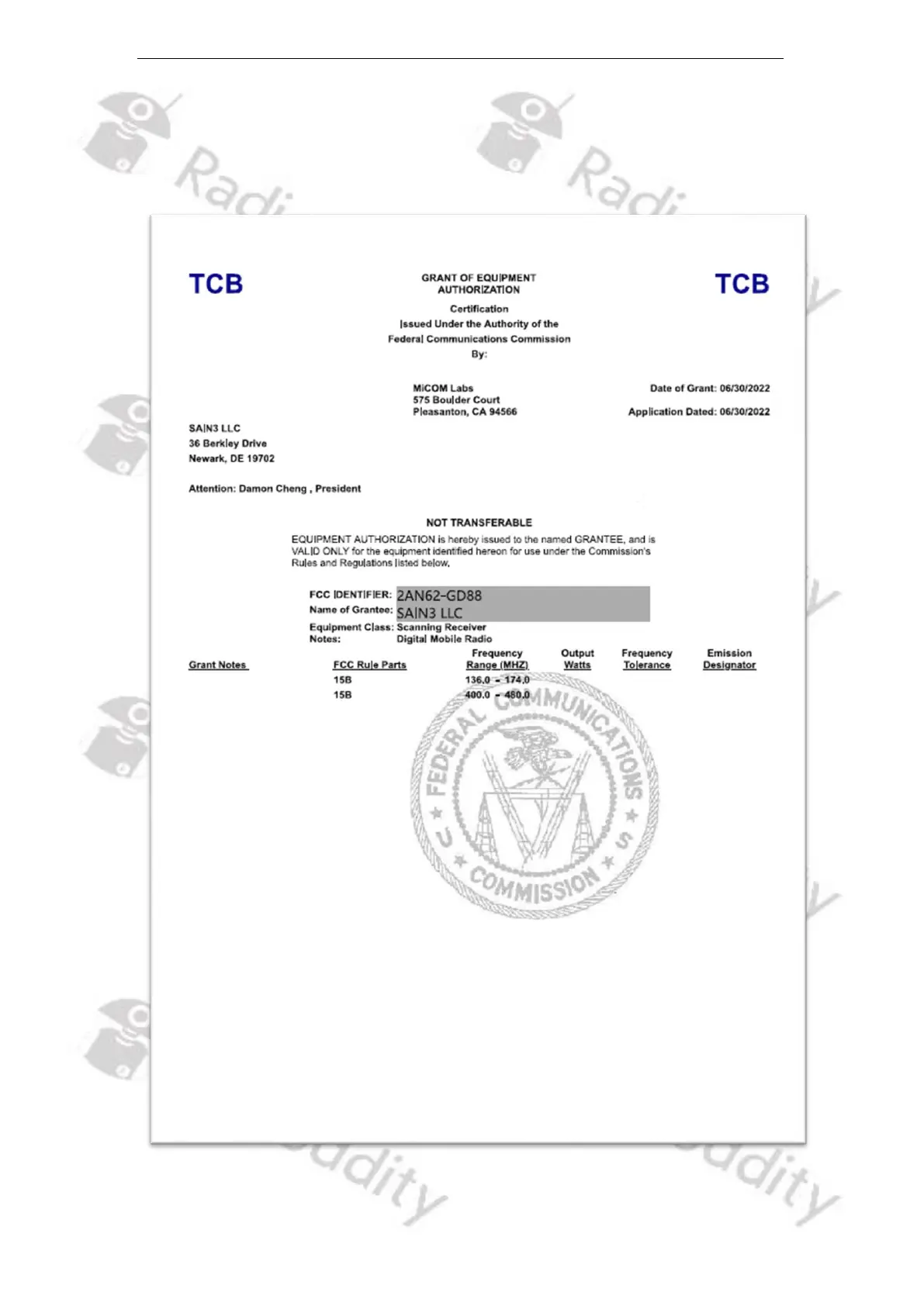Below you find a copy of the FCC part 90 approval for our Radioddity GD-88