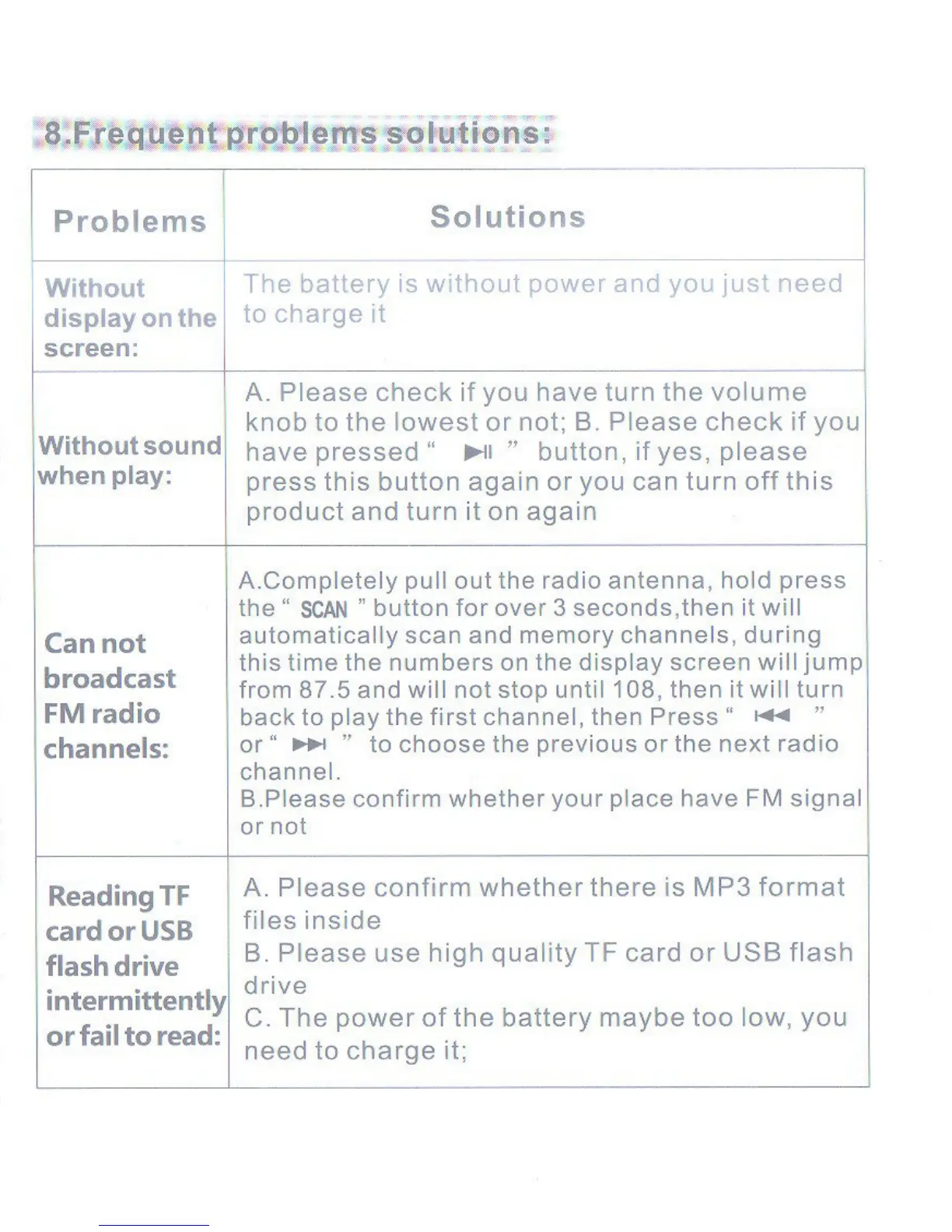 Radioddity Y-618 - Troubleshooting Common Issues; No Display on Screen; No Sound During Playback; FM Radio Channel Reception