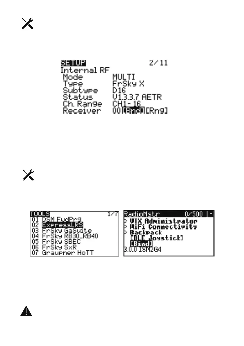 3:打开遥控器,长按SYS按钮,在“TOOLS”菜单中选择“ExpressLRS ”LUA。向下滚动至[Bind]并按确定键。