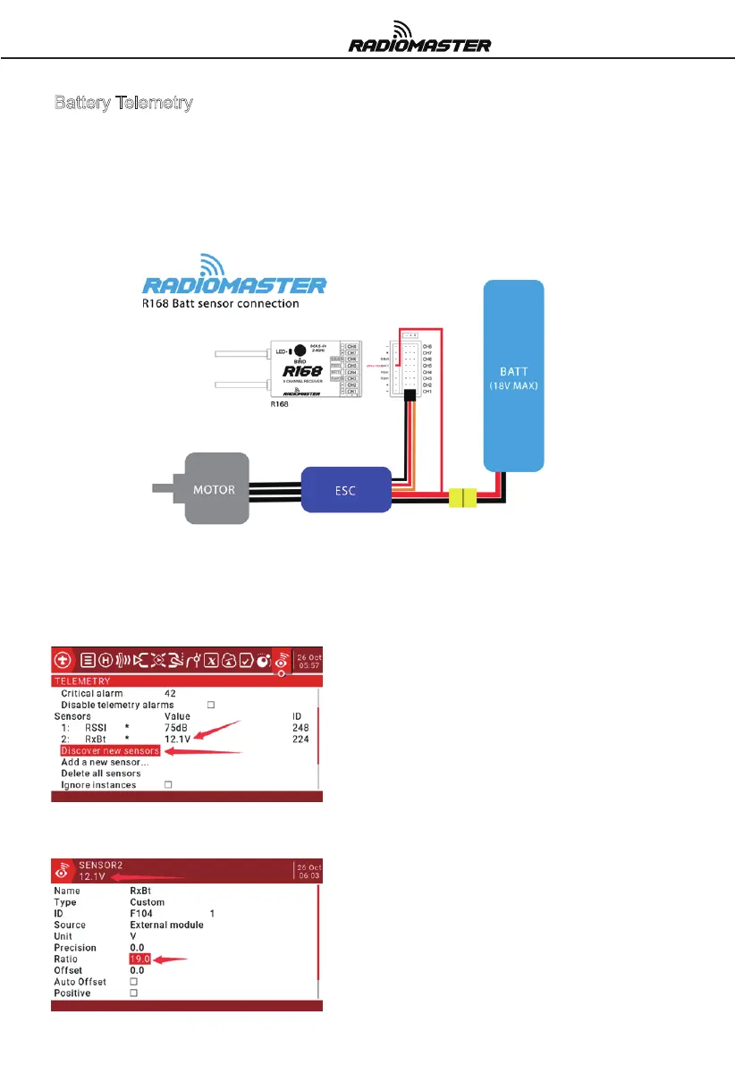 1. The R168 has built in voltage telemetry for your main flight battery or any battery up to 18v. Connect the