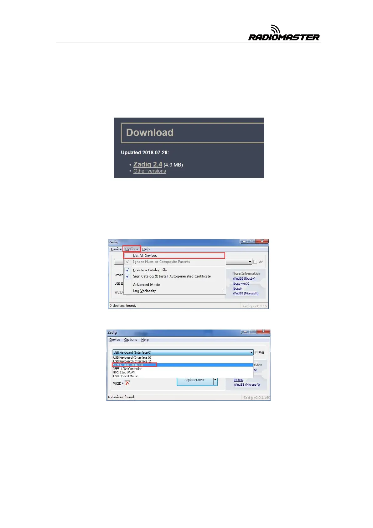 B. In the Zadig software, select Options-> List All Devices to view the device list