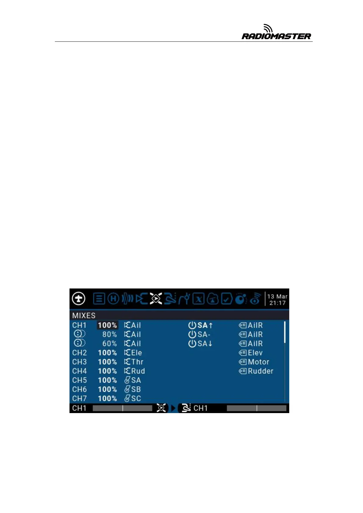 shown in the figure is input by the Ail gimbal, and the three states of the SA switch are