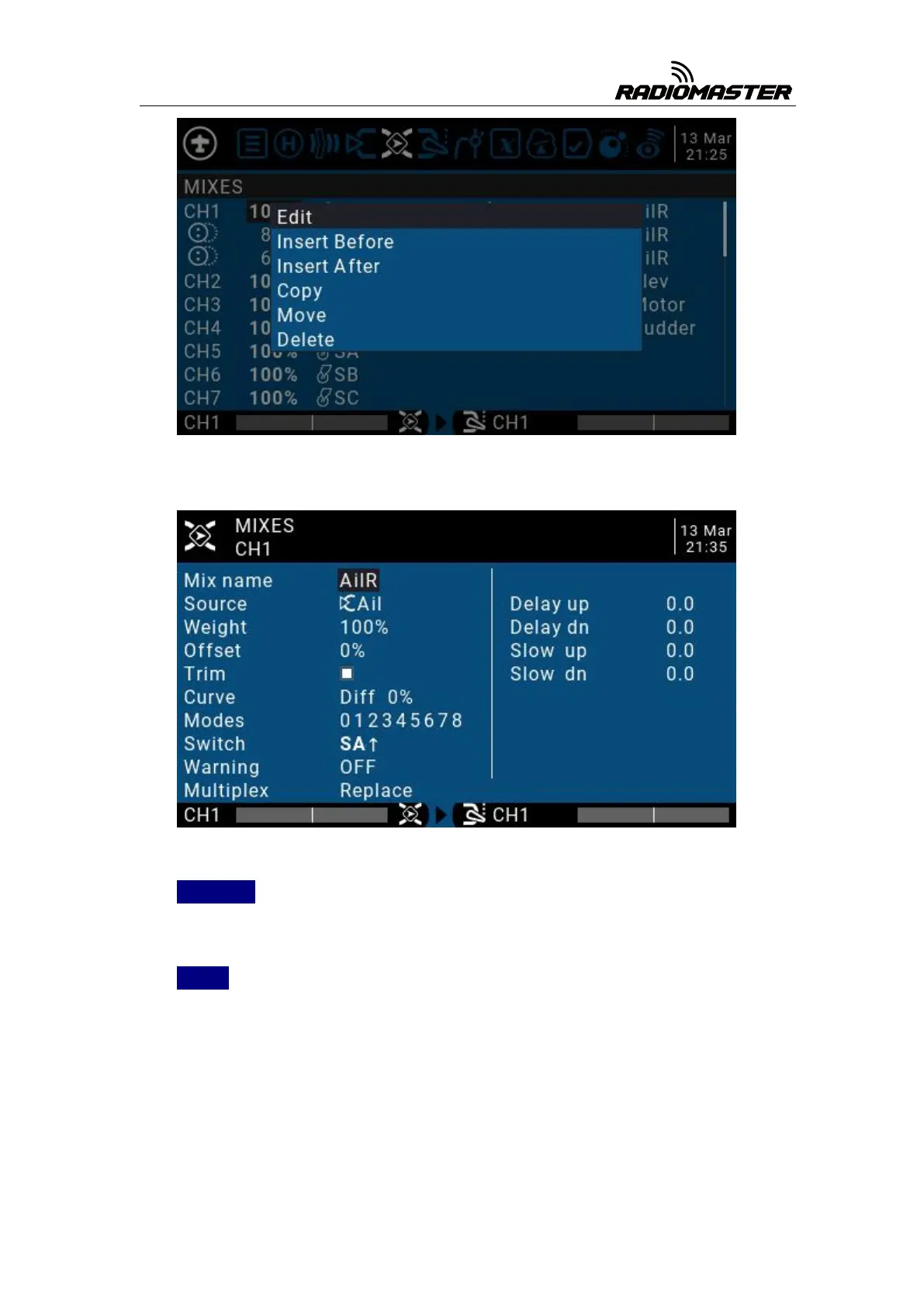 Detailed settings for mixing entries