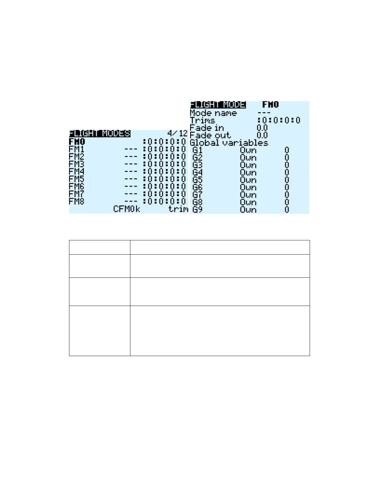 There are 8 flight modes plus the default FM0 available. The first item of FM1-FM8 requires a