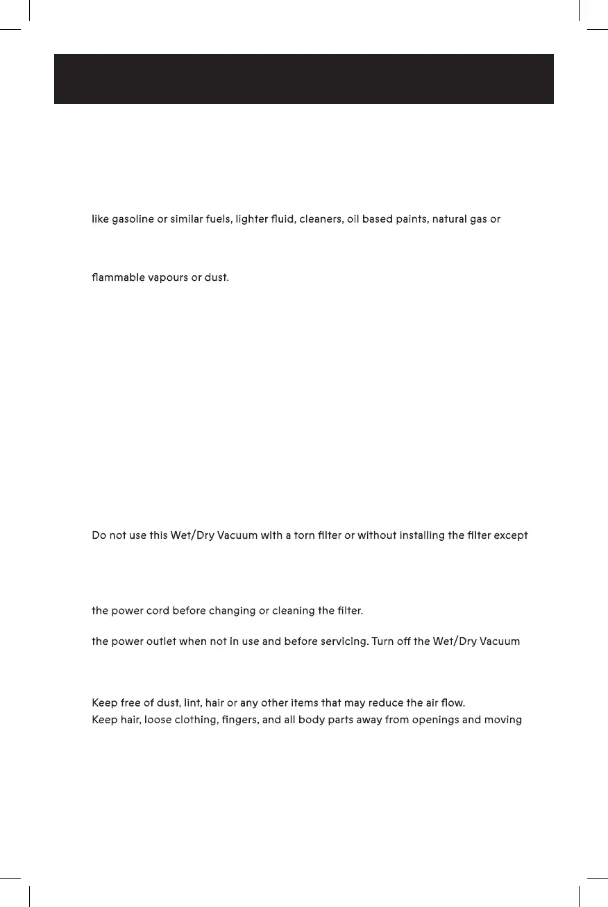 Do not vacuum, or use this Wet/Dry Vacuum near liquids, gases, or explosive vapours