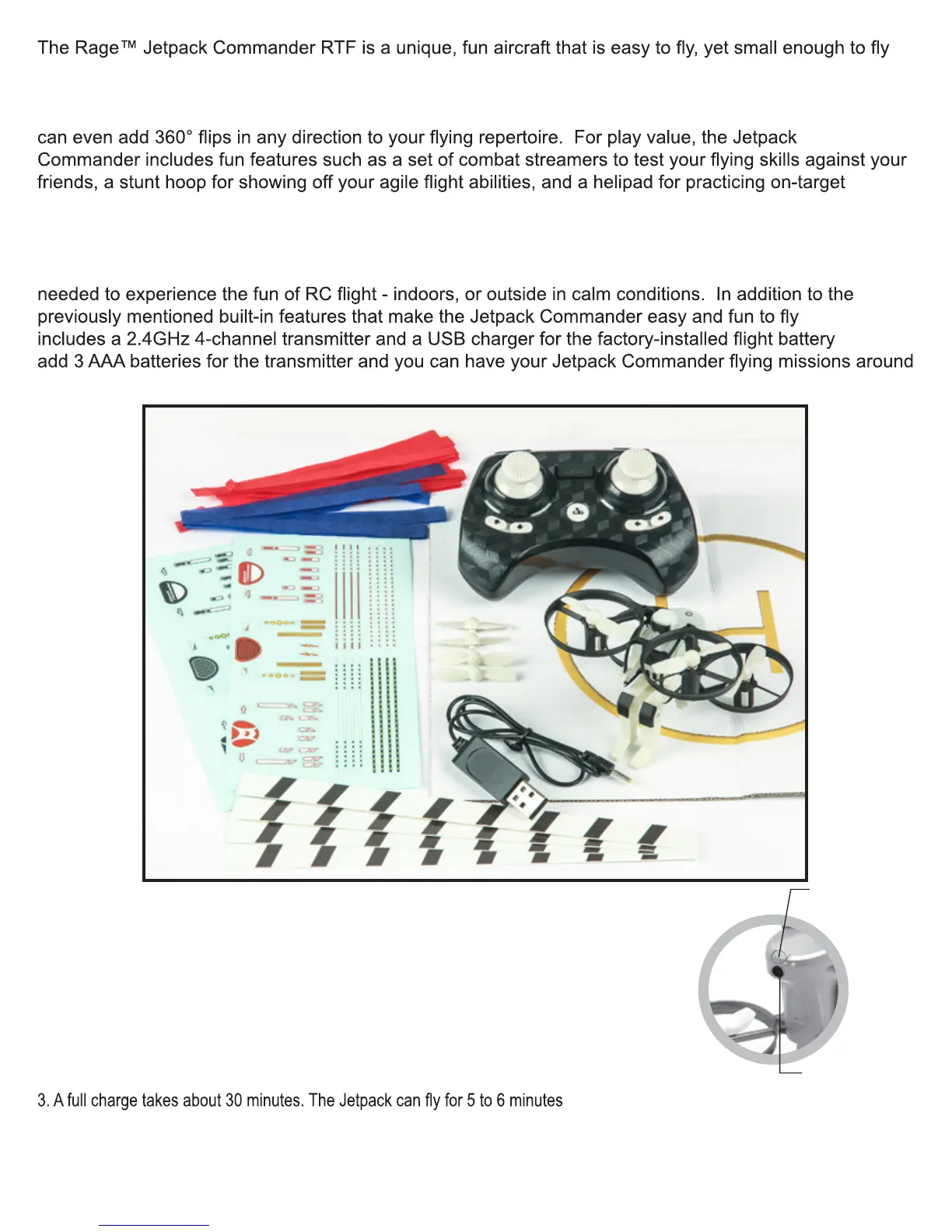The Jetpack Commander is RTF (Ready-To-Fly) aircraft, so it arrives factory-assembled with everything