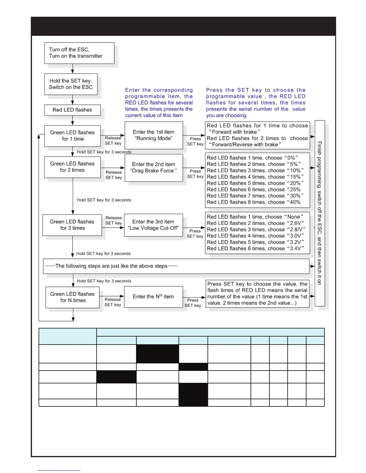 In the program process, the motor will emit “Beep” tone at the same time when the LED is flashing.