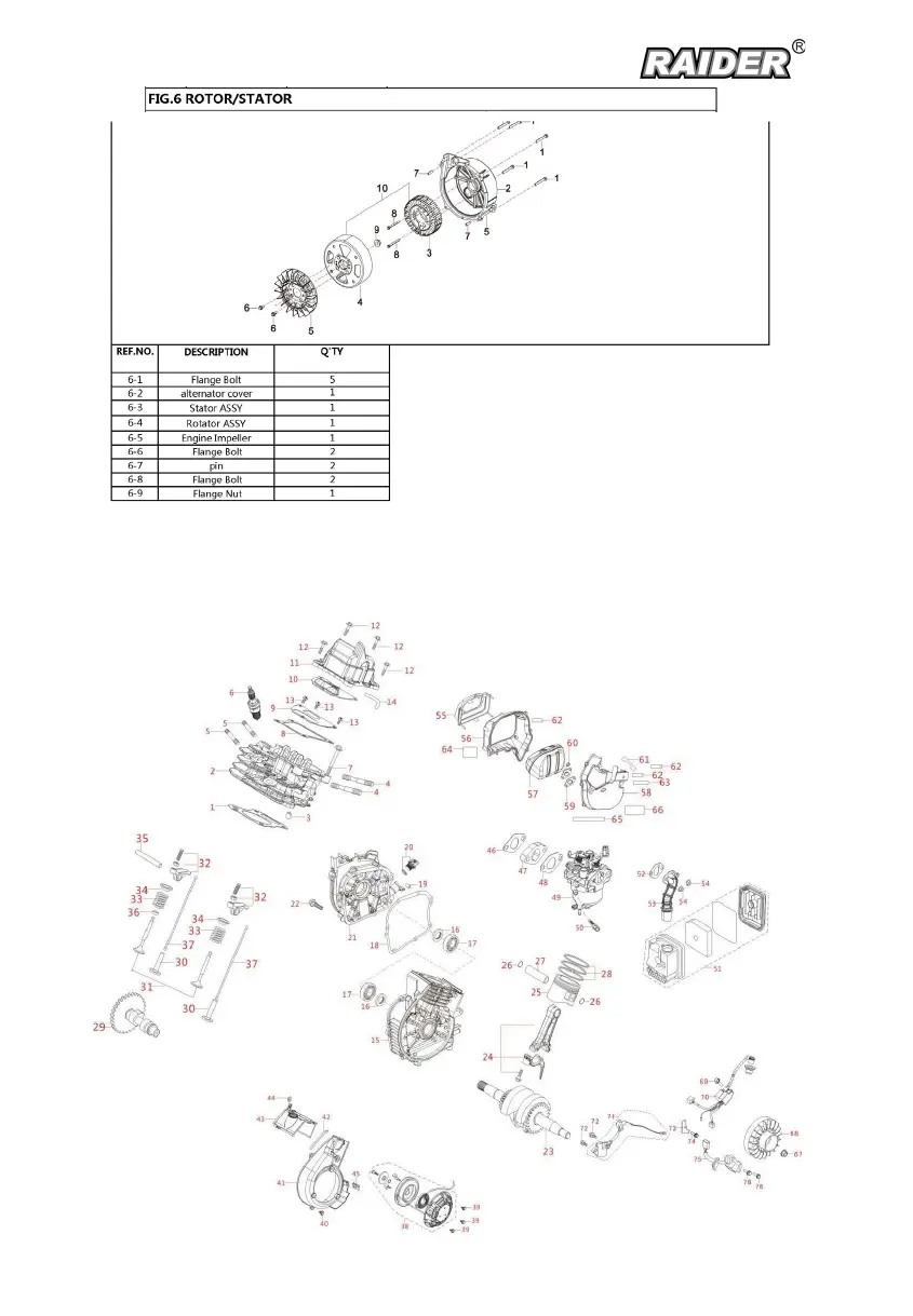 Raider RD-GG10 - Exploded Views and Parts Lists (Continued); Rotor, Stator, and Alternator Parts; Engine Component Diagram