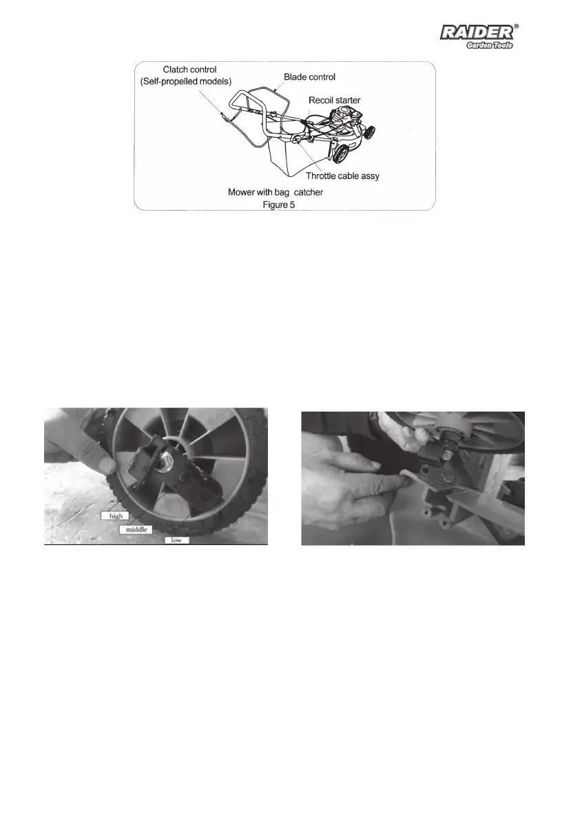 Ručka startera je pričvršćena na gornju ručicu. Pogledajte sliku 5: Stanite iza kosilice u radnom položaju