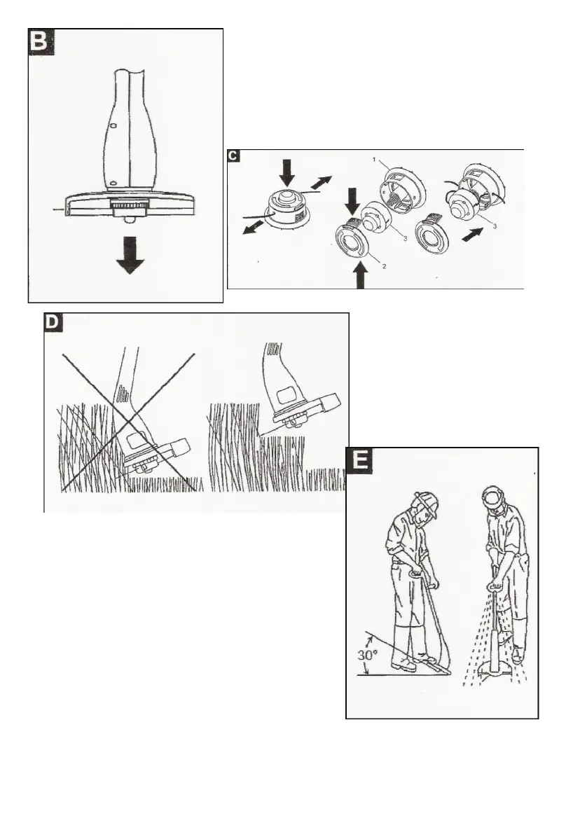 Високата трева трябва да се коси на слоеве, както е показано на фиг. D