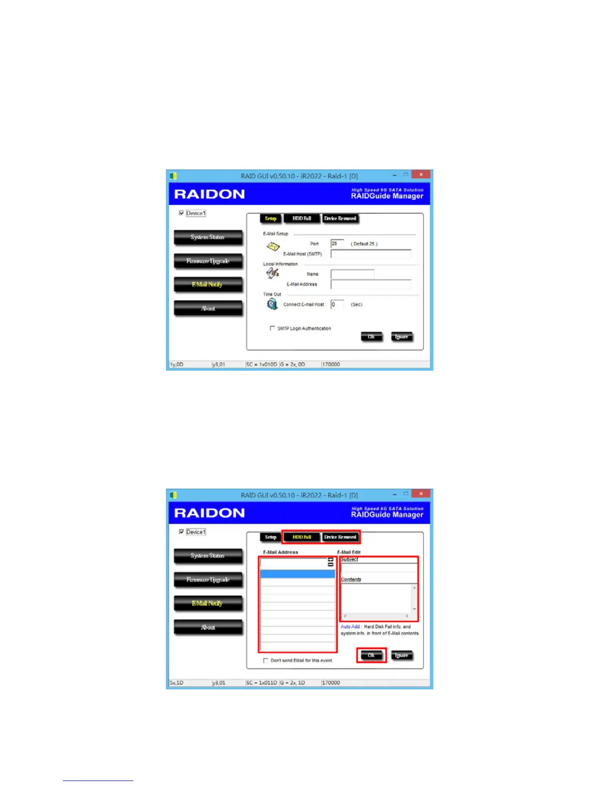Please first set up an e-mail address for the notification of a malfunction drive or the removed