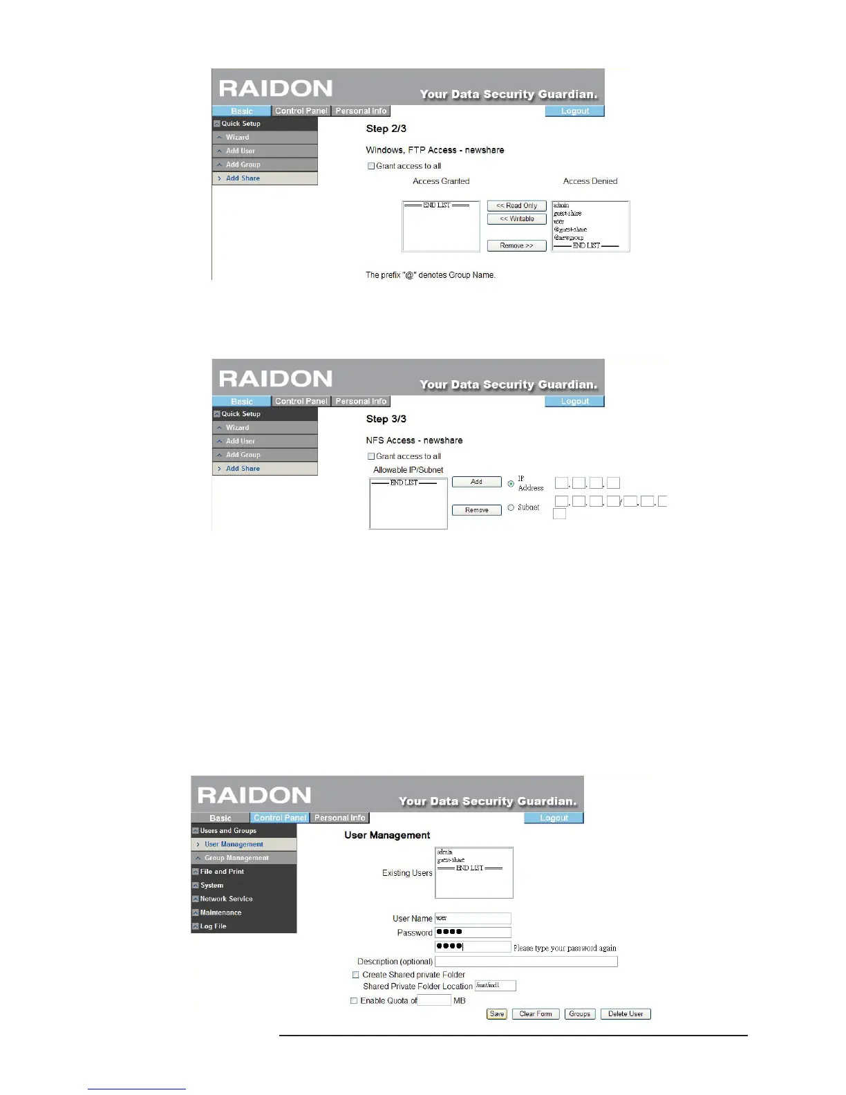 To set the access authority of NFS, check “allow access by all users” to allow all access or ll in the