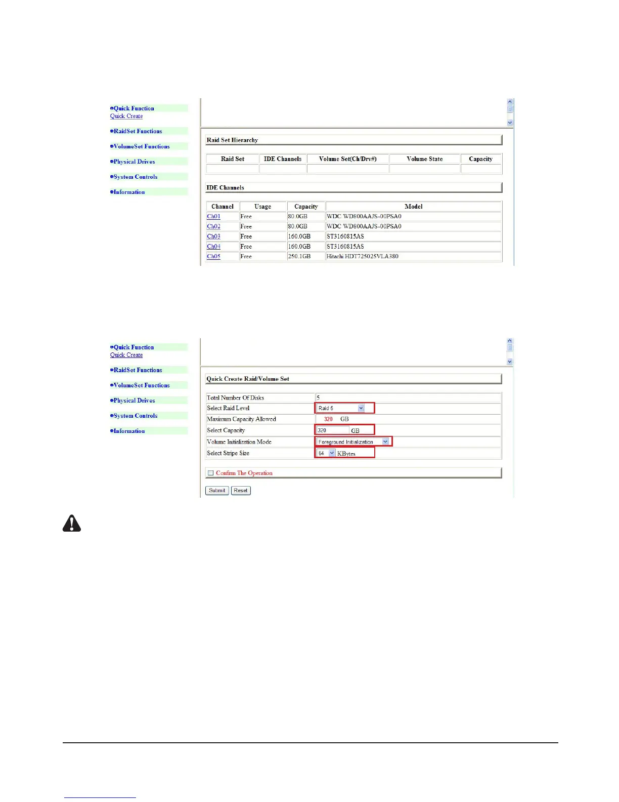 2) This screen displays Total Number of Disks, Raid Mode, Capacity of Disk, and Initialization Mode.