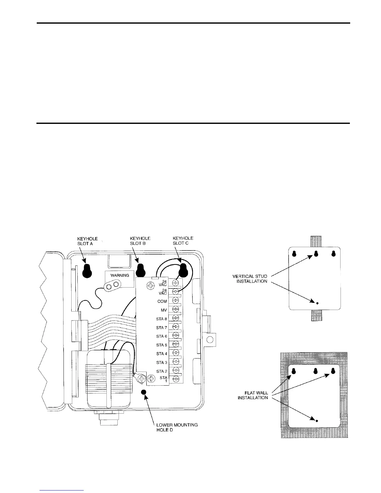 to a flat wall or vertical stud. Always use lower mounting hold "D" to secure the bottom of the controller.
