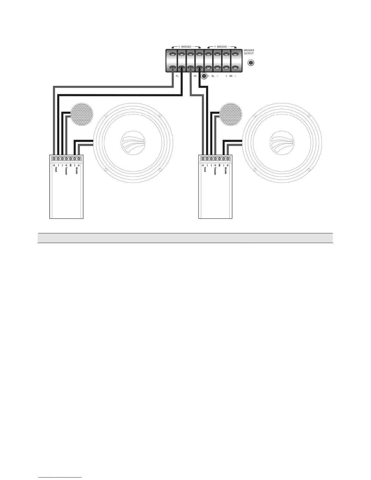 The bridge connection is performed at the clamps “FRONT” +FL (6) and FR– (6) or “REAR” +RL (7) and RR– (7)