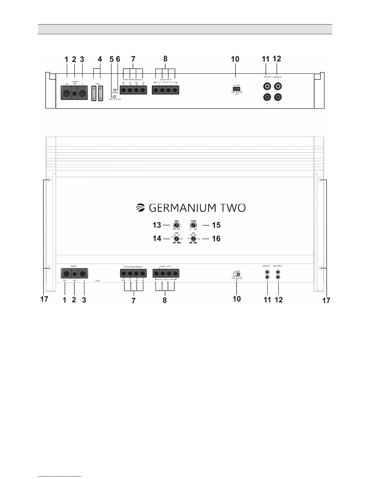 13 = Regler „Gain“ für die Einstellung der Eingangsempfindlichkeit von „LOW INPUT“