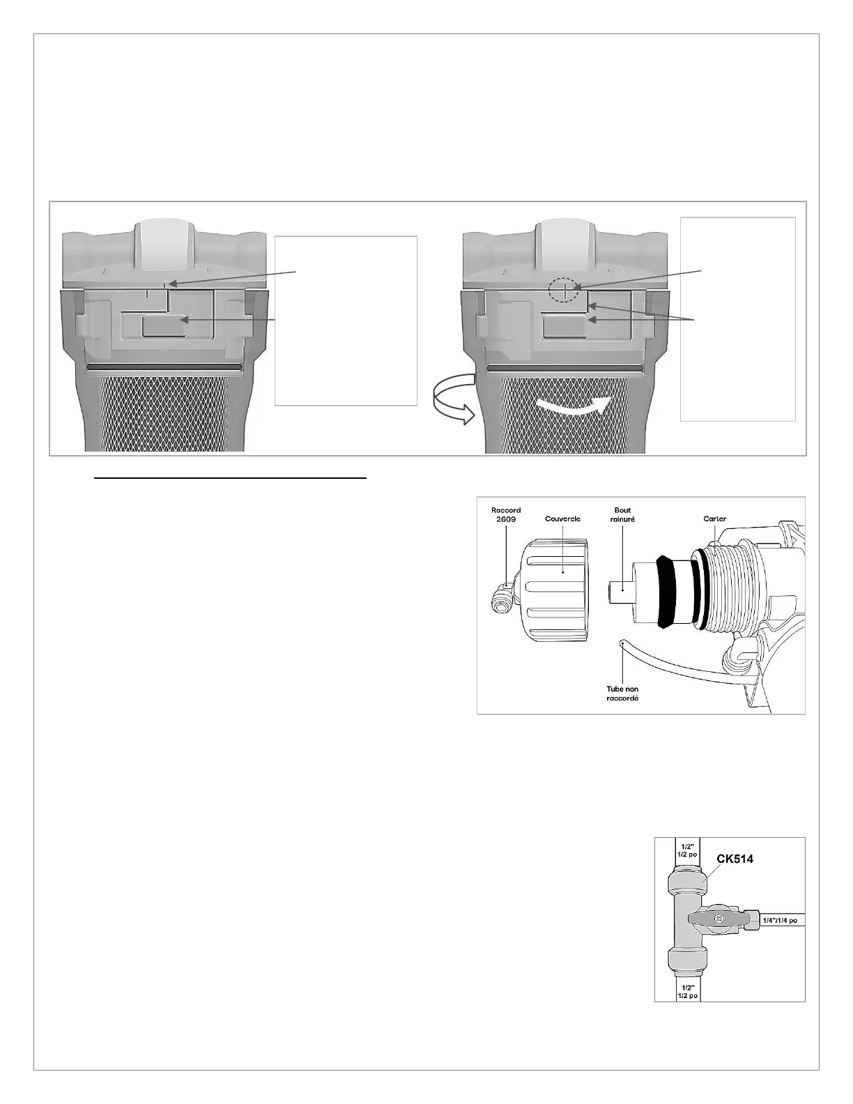 IV. Branchez le tube blanc au raccord du couvercle (2609). Faites une marque à 5/8 po du bout, enfoncez le bout
