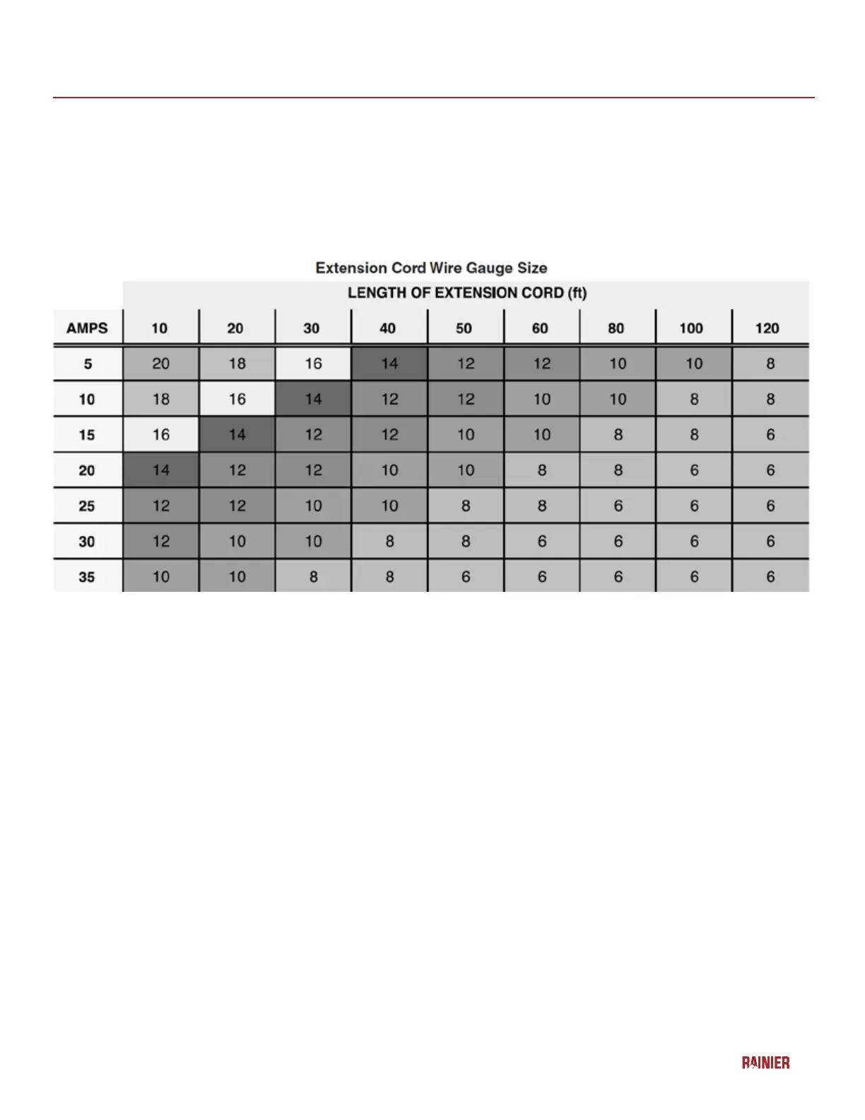 Rainier Outdoor Power Equipment assumes no responsibility for the content within this table. The use of this table is the
