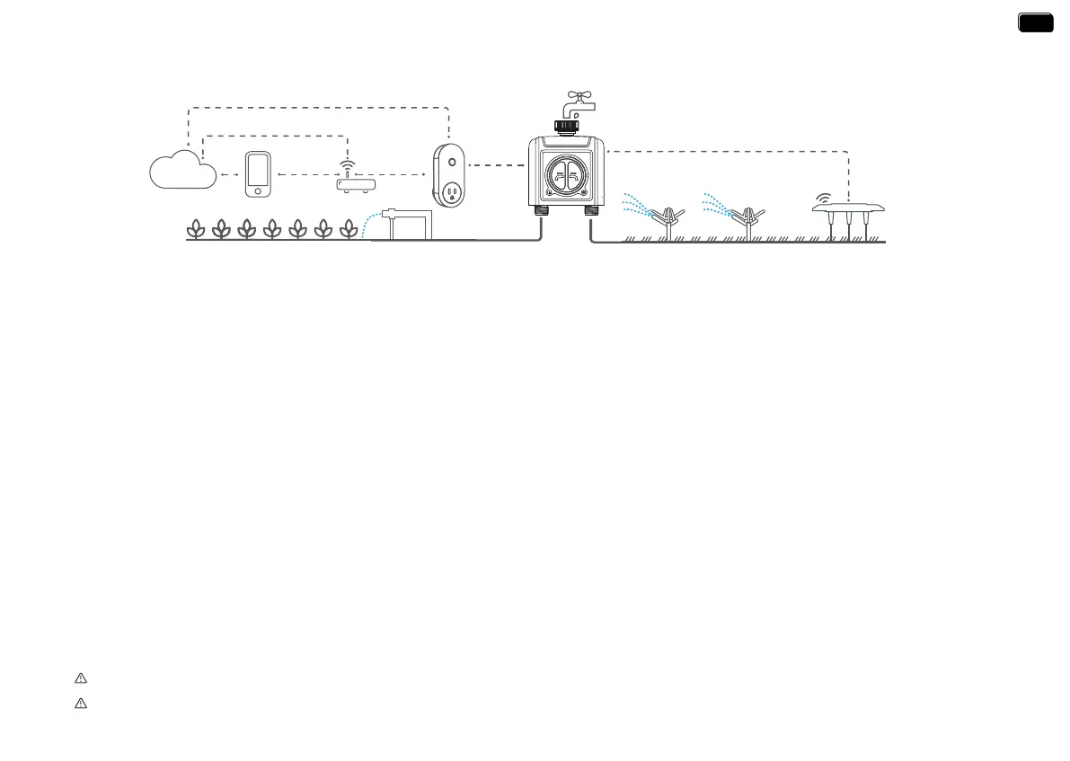 6) Automatic Watering: ① When the WiFi timer is connected to the WiFi soil sensor (not included), it can automatically irrigate or stop according to