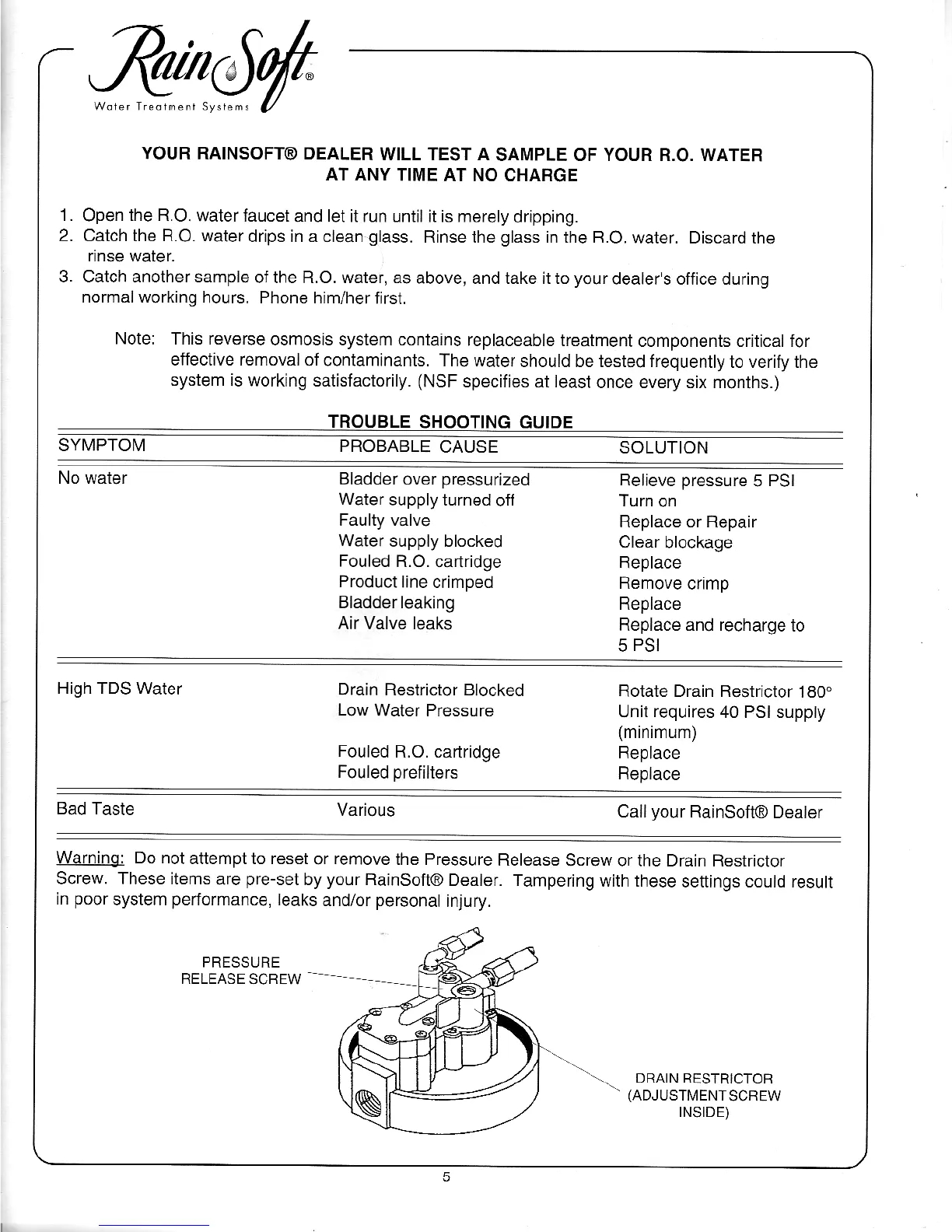 RainSoft 9596 - Troubleshooting and Dealer Services; Dealer Water Testing Service; Troubleshooting Guide