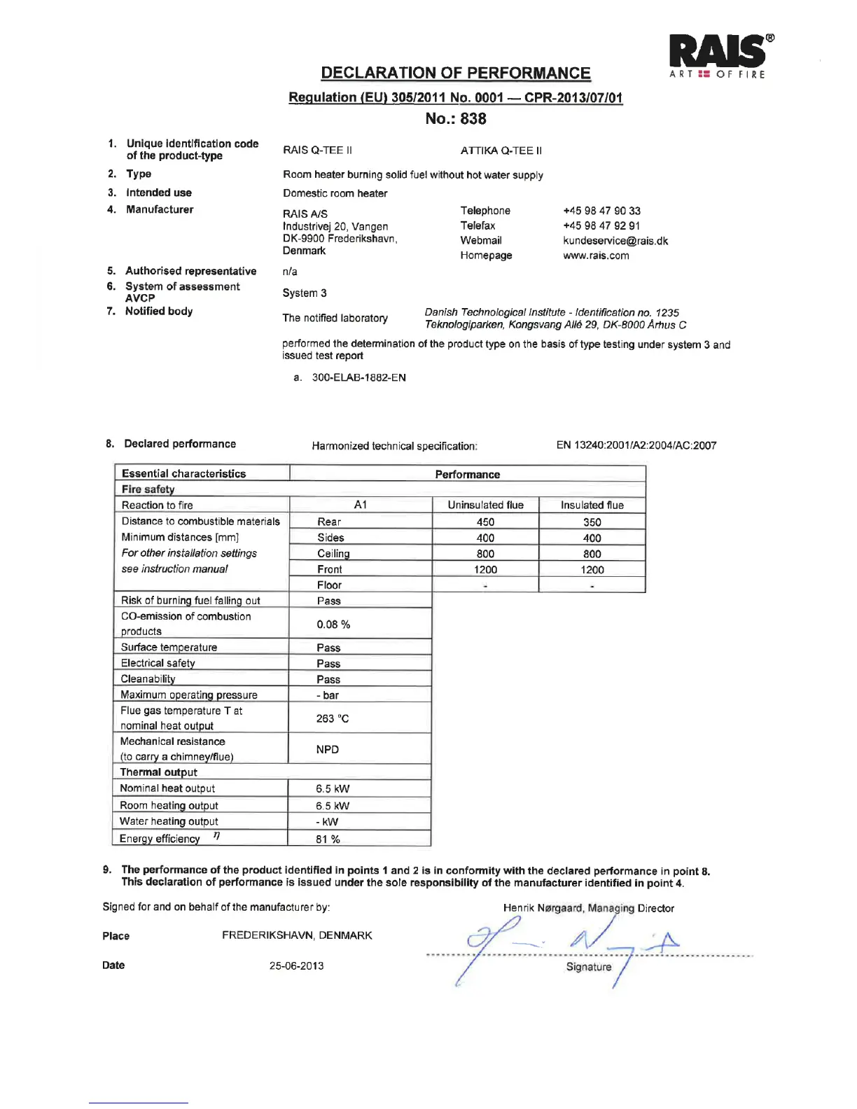 RAIS Q-Tee 2 - Declaration of Performance; Product Safety and Performance Data