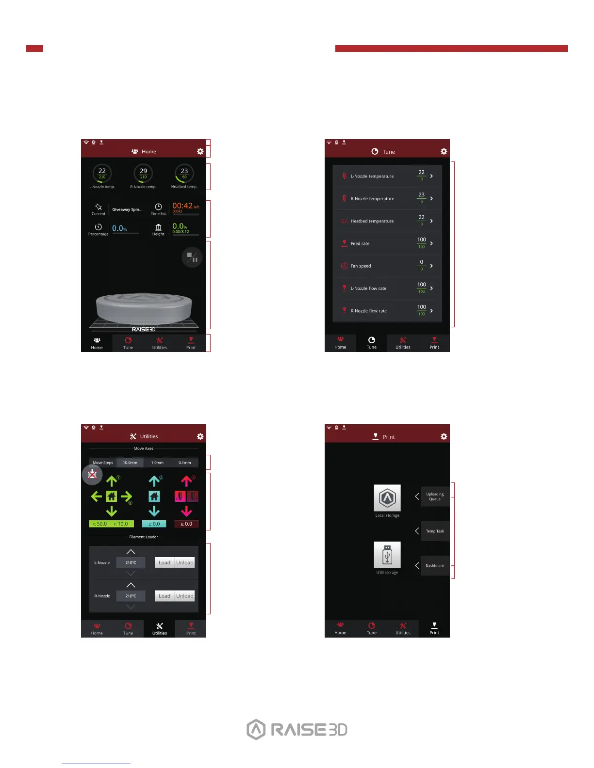 RAISE 3D Pro2 Series - G. User Interface; Home Screen Elements; Tune Screen Controls; Utilities Screen Functions