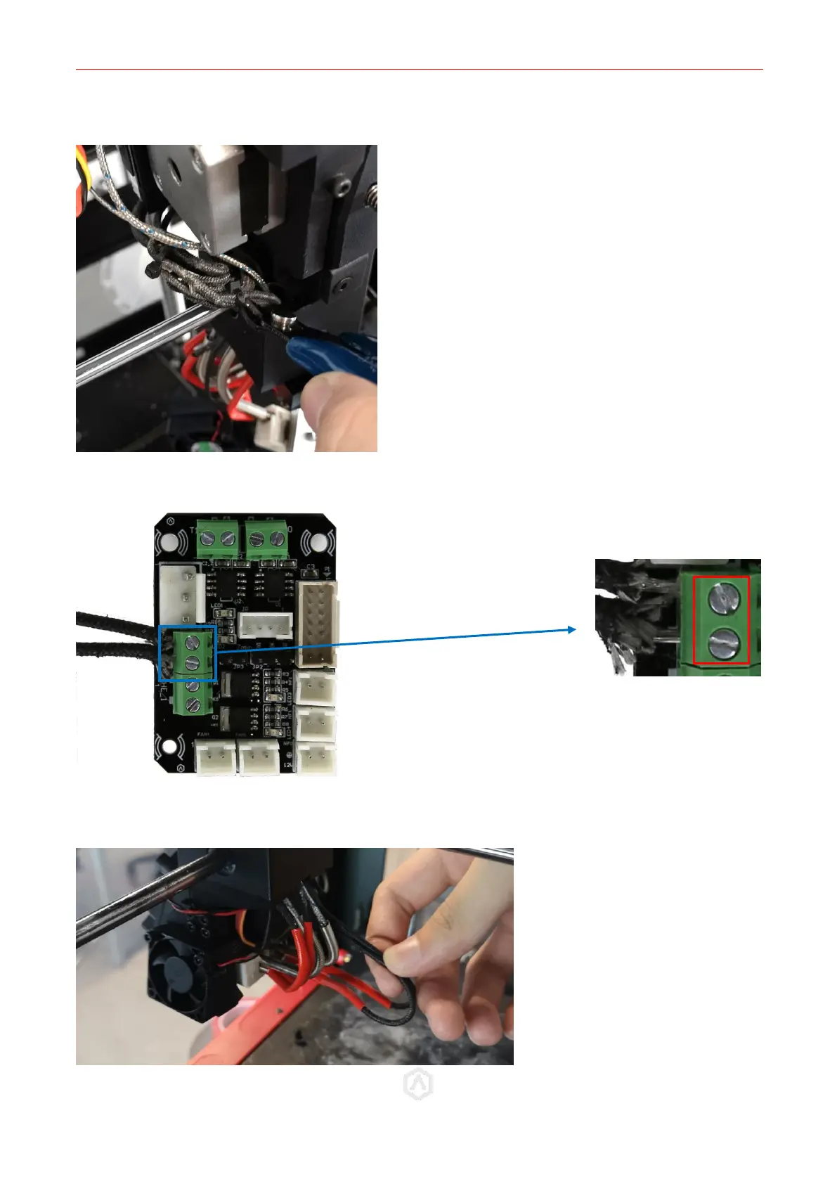 Loosen the screws marked in following image. And remove the Heating Rod cables from extruder