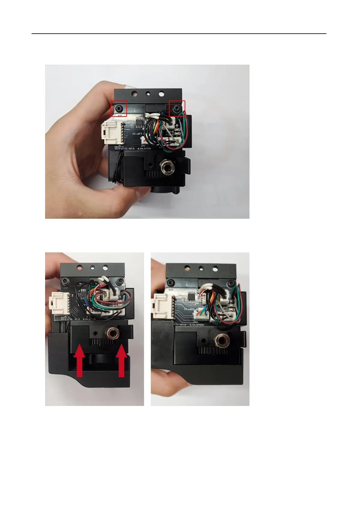 24. Put the front cover back to the extruder, and use the 2mm hex wrench to reinstall the two